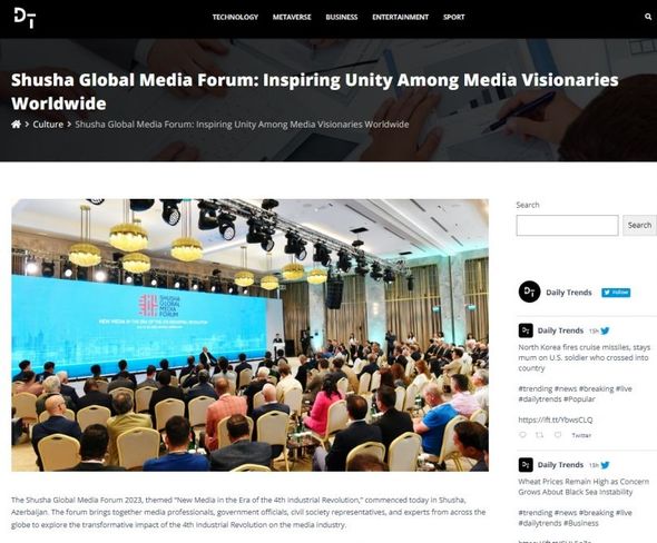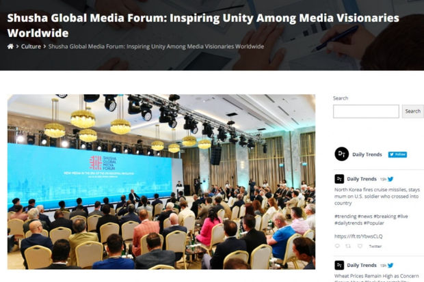 Birləşmiş Krallığın “Daily Trends” qəzetinin dərc etdiyi “Şuşa Qlobal Media Forumu: Dünyanın media liderləri arasında ilhamverici birlik” sərlövhəli xəbərdə bildirilib ki, tədbirin məqsədi qlobal media meyillərini təhlil etmək, milli imkanları gücləndirmək, beynəlxalq əməkdaşlığı inkişaf etdirmək və media sektorunda dördüncü sənaye inqilabi dövründə təqdim olunan çağırışları və imkanları araşdırmaqdır. Xəbərdə Prezident İlham Əliyevin əsas mövzularla, o cümlədən yeni media sahəsində irəliləyişlər və Azərbaycanın regionda strateji əhəmiyyəti ilə bağlı fikirləri yer alıb.