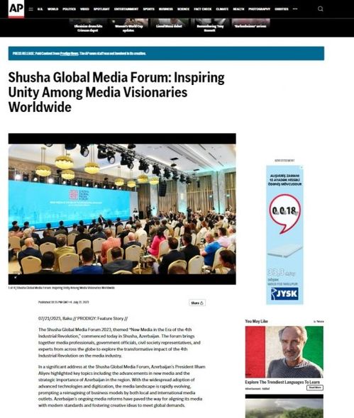 AZƏRTAC xəbər verir ki, ABŞ-ın “The Associated Press” agentliyi və “New York Insider” xəbər portalı Şuşa Qlobal Media Forumunun keçirilməsinin əsas məqsədi, Prezident İlham Əliyevin tədbirdəki çıxışının əsas məqamları ilə bağlı yazılar dərc edib. Məqalələrdə bildirilib ki, Forum 4-cü Sənaye İnqilabının media sənayesinə transformativ təsirini araşdırmaq üçün dünyanın hər yerindən media mütəxəssislərini, hökumət rəsmilərini, vətəndaş cəmiyyəti nümayəndələrini və ekspertləri bir araya gətirib.