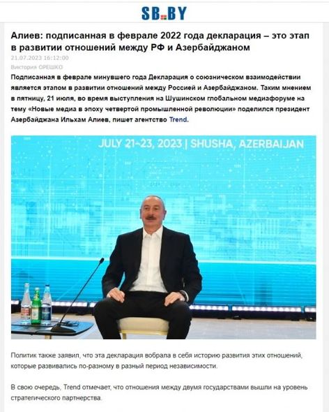Şuşa Qlobal Media Forumu ilə xəbərlər Rusiya mediasının da diqqət mərkəzindədir. Bu ölkənin rəsmi TASS agentliyi, habelə “Vestnik Kavkaza” xəbər portalı Prezident İlham Əliyevin Rusiya-Azərbaycan münasibətləri, Azərbaycanın Moskva ilə Vaşinqton arasında münasibətlərin bərpası üzrə danışıqlar məkanı ola biləcəyi barədə fikirləri yer alıb. Qeyd olunub ki, dövlət başçısı Moskva ilə münasibətlərin strateji tərəfdaşlıq səviyyəsində olduğunu, həmçinin konkret nəticələrə əsaslandığını bildirib.