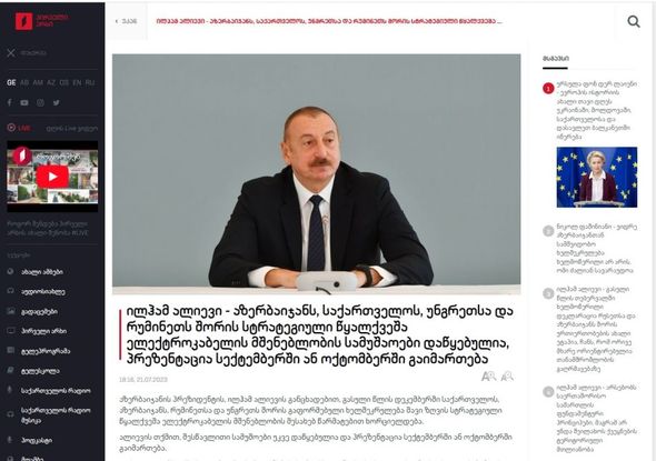 Gürcüstanın “1tv.ge” saytı da Prezident İlham Əliyevin Şuşa Qlobal Media Forumunda Gürcüstan, Azərbaycan, Rumıniya və Macarıstan arasında Qara dənizdə strateji əhəmiyyətə malik sualtı elektrik kabelinin çəkilməsi haqqında imzalanmış sazişin uğurla həyata keçirilməsi, Ermənistanla Azərbaycan arasında münasibətlərin normallaşması, cənubi Qafqazın regional inkişafı ilə bağlı fikirlərinə xüsusi yer verilib.