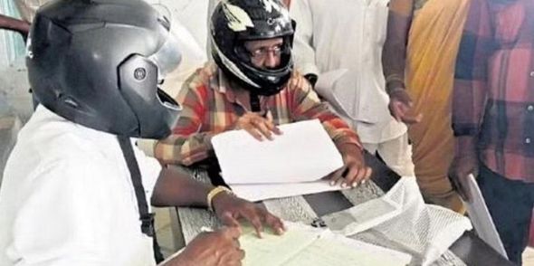 Hindistanda dövlət qurumlarından birinin işçiləri başlarına düşən tavan parçalarından qorunmaq üçün dəbilqədə işləməyə məcburdurlar.