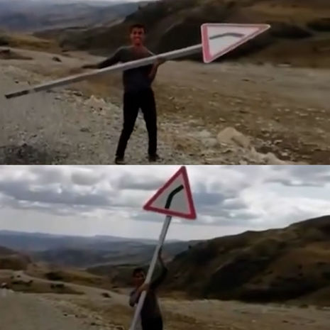 Görüntüdən məlum olur ki, vətəndaş yol nişanının düzgün qoyulmadığını və bu səbəbdən lazımsız olduğunu əsas gətirərək onu yerindən çıxardıb kənara atır.
