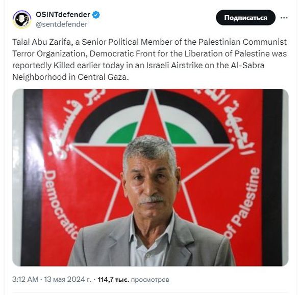 Bildirilir FADC liderlərindən biri hesab edilən politoloq Qəzza şəhərinin Sabra rayonuna hücum nəticəsində həlak olub. Hərbi əməliyyatın təfərrüatı hələlik açıqlanmayıb.