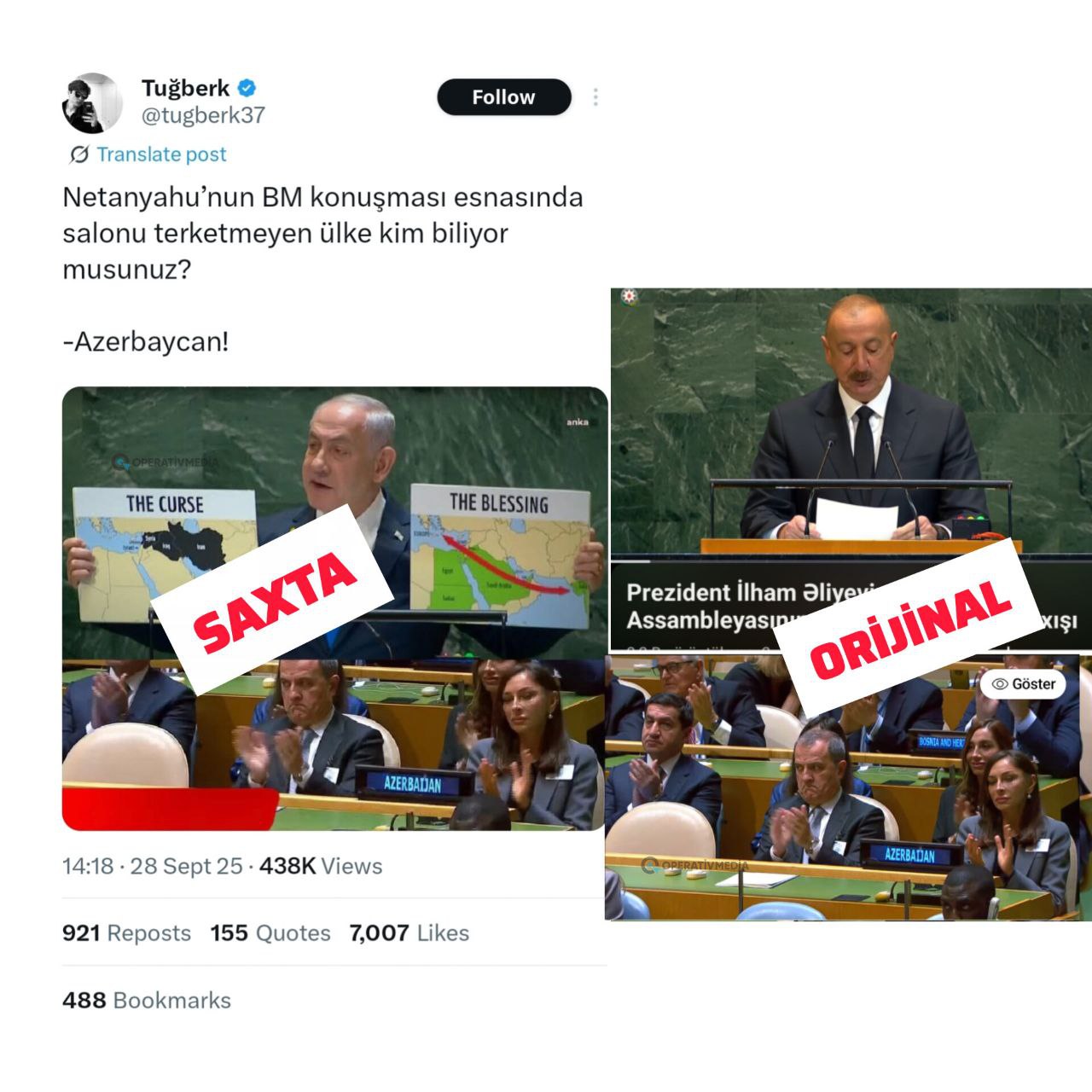 Azərbaycanın dəfələrlə verdiyi rəsmi açıqlamalara və təkziblərə baxmayaraq, dezinformasiyaların tirajlanması davam edir. Hətta BMT-nin 80-ci sessiyası çərçivəsində yayılan saxta fotolar buna bariz nümunədir: iddia edilirdi ki, Azərbaycan nümayəndə heyəti Netanyahunun çıxışını dinləyib və alqışlayıb. Halbuki BMT müzakirələri açıq şəkildə canlı yayımlanır, Azərbaycanın media nümayəndələri də prosesi yerində işıqlandırıblar. Hamının gözü qarşısında baş verən bir tədbirə saxta foto montajları ilə “rəng qatmaq” yalnız kampaniyanın məqsədyönlü xarakterini göstərir.