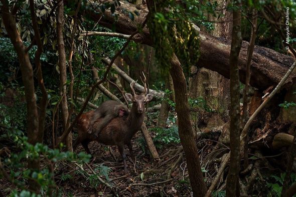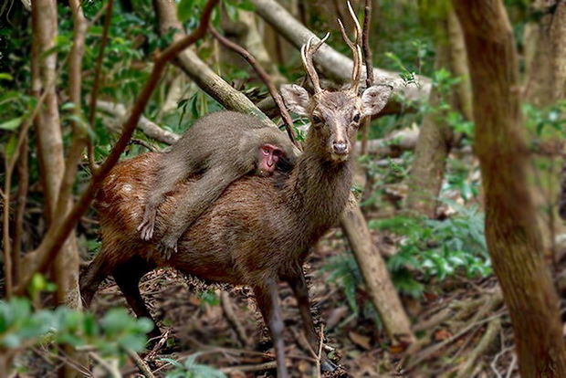 Fotonun müəllifinin sözlərinə görə, meymun uzun müddət maralın belində meşəni gəzib.