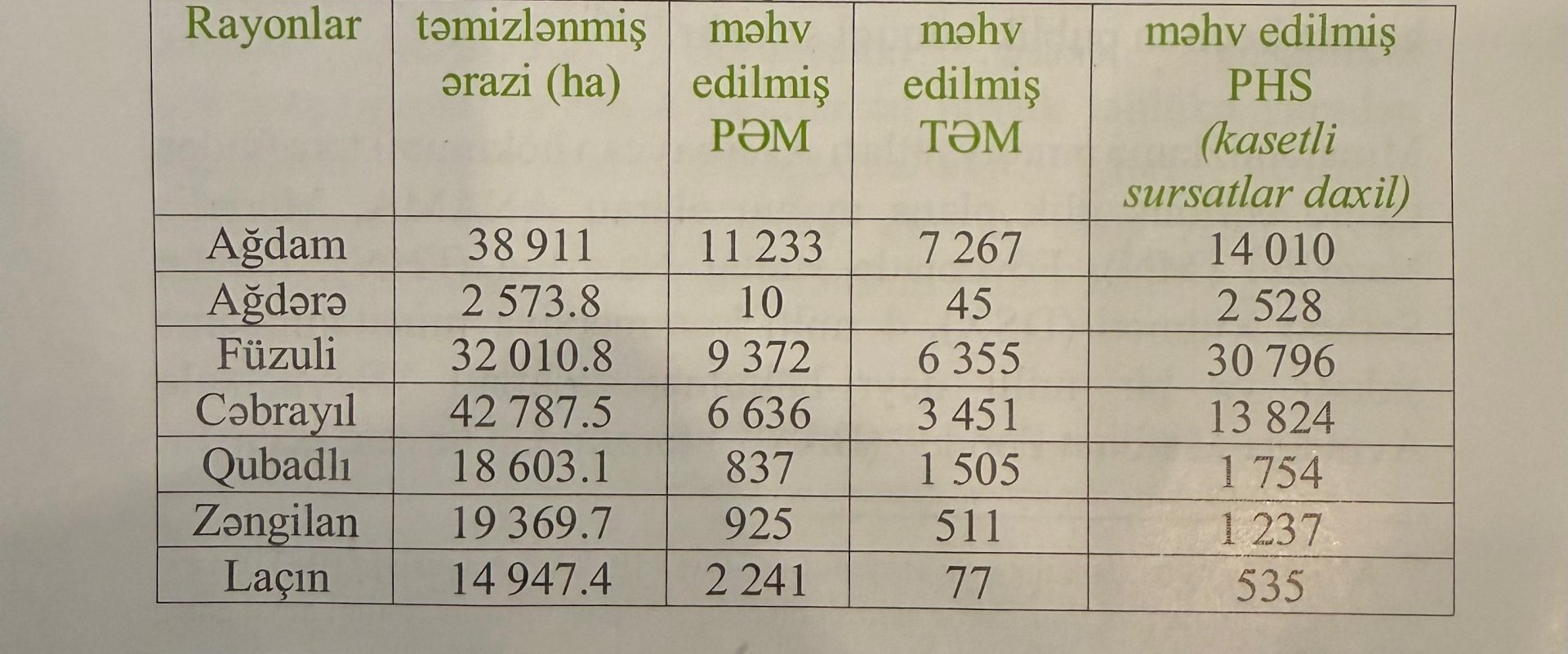 zamanı təmizlənmiş ərazi və tapılaraq zərərsizləşdirilmiş