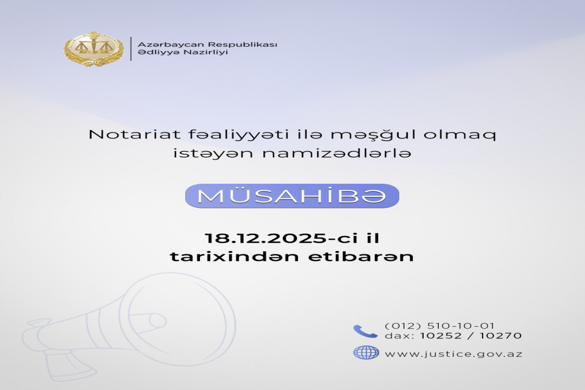 Nazirliyin İxtisas komissiyası bildirib ki, notariat fəaliyyəti ilə məşğul olmaq istəyən hüquqşünaslar üçün elan olunmuş müsabiqə üzrə 14 noyabr 2025-ci il tarixində keçirilmiş test imtahanında uğur qazanmış namizədlərlə müsahibənin keçirilməsinə dekabr ayının 18-dən etibarən başlanılacaq.