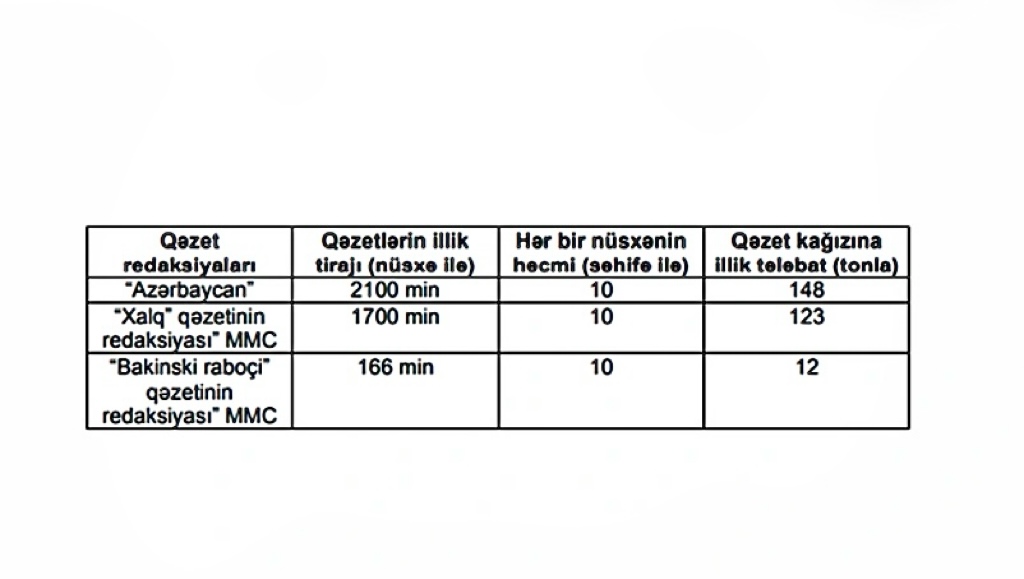 Qərara əsasən, dövlət sifarişlərinin yerinə yetirilməsi üçün “Azərbaycan” qəzeti redaksiyasına, “Xalq” qəzetinin redaksiyası” Məhdud Məsuliyyətli Cəmiyyətinə və “Bakinski raboçi” qəzetinin redaksiyası” Məhdud Məsuliyyətli Cəmiyyətinə dövlət büdcəsinin vəsaiti hesabına alınacaq qəzet kağızının norması aşağıdakı kimidir: