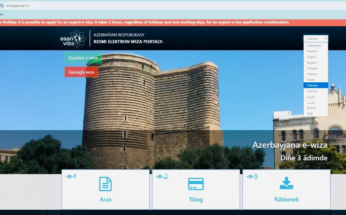 Azərbaycan Respublikasına səfər etmək istəyən Türkmənistan vətəndaşları üçün “ASAN Viza” portalının türkmən dilində versiyası istifadəyə verilib.